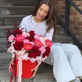 Сборная композиция с пионами, ажурными розами, диантусами