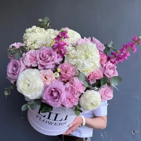 Композиция из гортензий, роз, пионов и веточек эвкалипта в коробке