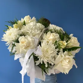 Цветочная композиция в белых оттенках - настоящий праздник для глаз и души. Гортензия, с её пышными, округлыми соцветиями добавляет шарма, а одноголовые хризантемы и ажурные розы излучают нежность и гармонию. Цветы создают атмосферу радости и оптимизма, словно напоминая о приятных светлых днях. В дополнение к гортензии используются свежие зелёные акценты, которые придают композиции легкость и воздушность. Идеально подойдет на любое торжество или просто для того, чтобы поднять настроение себе и близким. Такой подарок каждый момент сделает особенным!