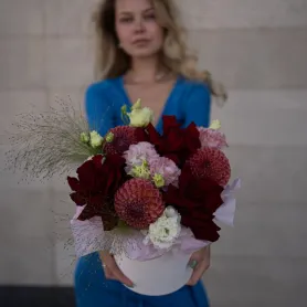 Настоящий фейерверк красок и эмоций! Георгины насыщенного цвета привлекают внимание и создают атмосферу праздника. Розы добавляют романтики и утонченности, а эустома вносит нотку нежности и свежести. Гармоничное сочетание цветов идеально подходит для любого торжества или просто для того, чтобы поднять настроение. Композиция станет прекрасным подарком, наполняя пространство светом и радостью, и оставляя незабываемое впечатление!
