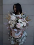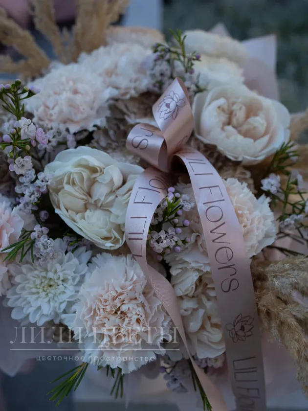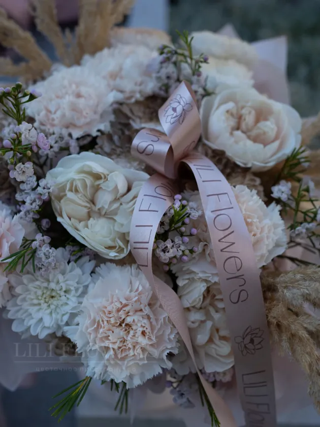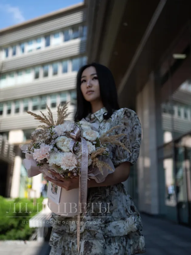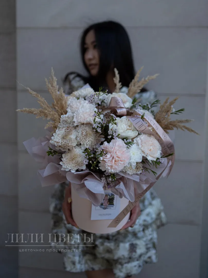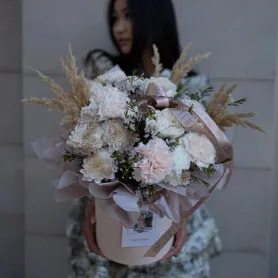Изысканная цветочная композиция в стильной коробке создаёт ощущение утончённой простоты и природной красоты. Нежные цветы диантуса в сочетании с кустовой розой и крупной аккуратной хризантемой придают особый шарм и изысканность. Идеальный выбор для выражения благодарности, любви или просто чтобы порадовать близких, эта композиция подчеркнёт вашу внимательность и заботу.