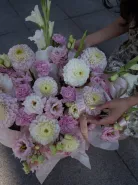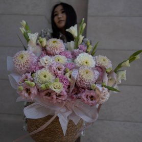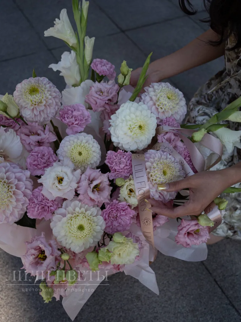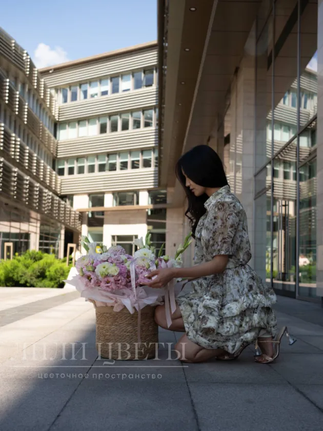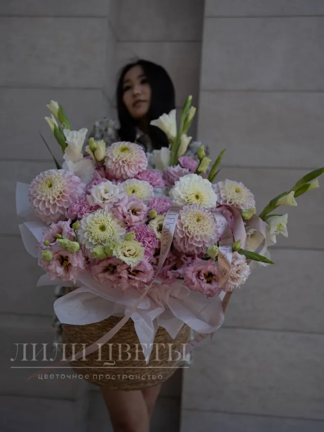 Цветочная композиция в корзине выполнена в белых и светло розовых оттенках. Каждый цветок в этой корзине рассказывает свою историю: георгины с их пышными, округлыми лепестками придают композиции объем и радость, а пастельные тона создают атмосферу уюта и тепла. Эустомы добавляют романтичности и элегантности. Гладиолусы придают композиции грацию и величие, их длинные стебли и аккуратные соцветия создают контраст, подчеркивая гармонию всей композиции.