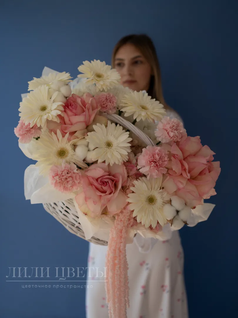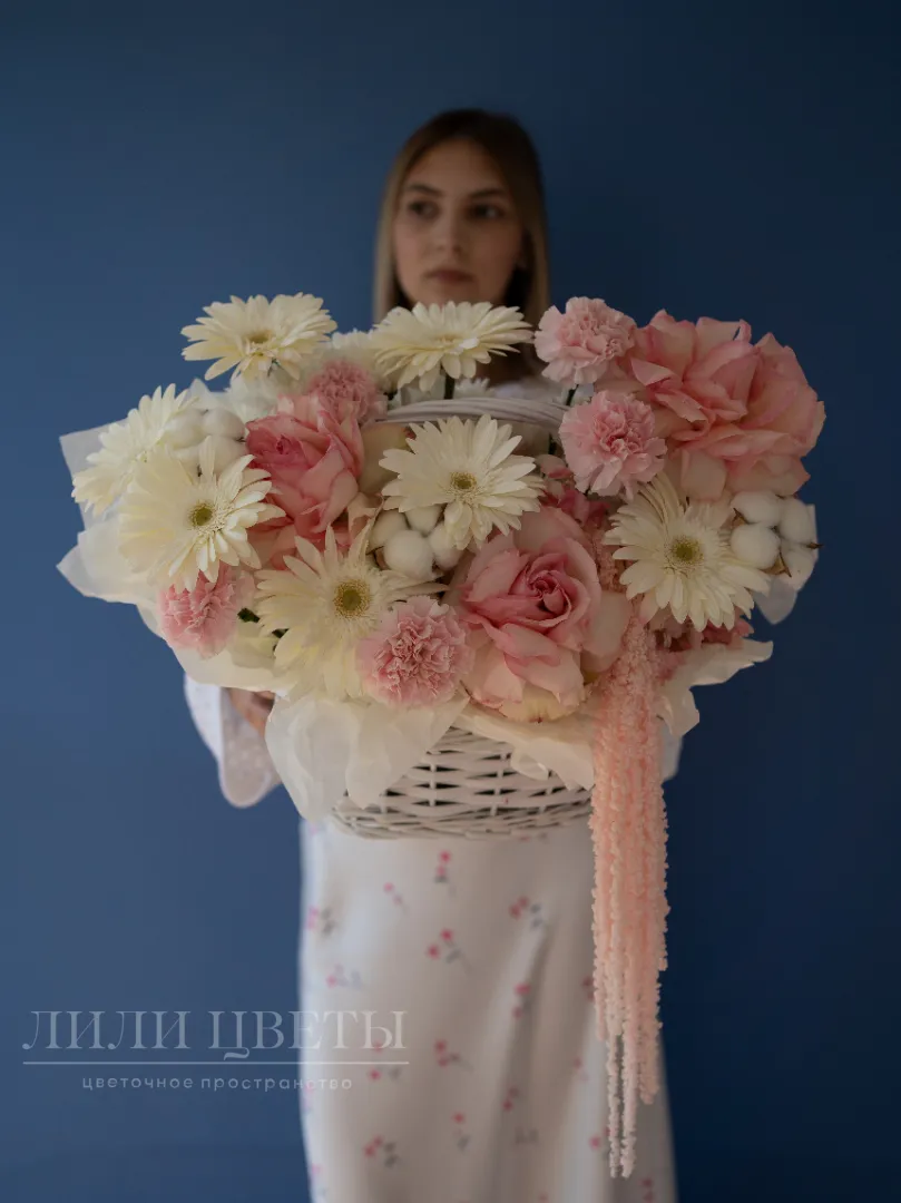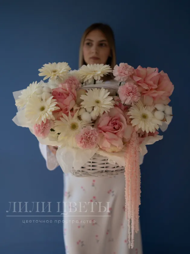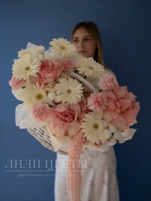 Цветочная композиция в корзинке сделана в нежных белых и розовых тонах, создает атмосферу элегантности и утонченности. В ней гармонично сочетаются мягкие лепестки ажурных роз, символизирующие любовь и нежность, и другие различные цветы и дополнительные украшения, композиция излучает свежесть и чистоту. Такой подарок идеально подойдет для особых случаев: романтического признания, поздравления или просто порадовать близкого человека. Его гармония и изящество подчеркнут важность момента и создадут уютную атмосферу.