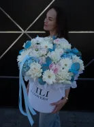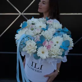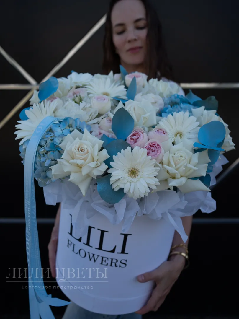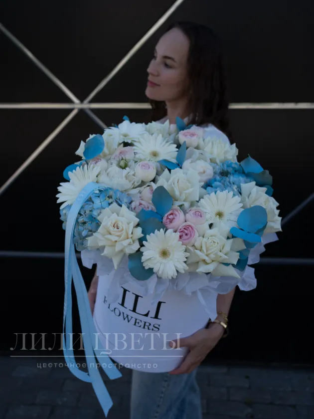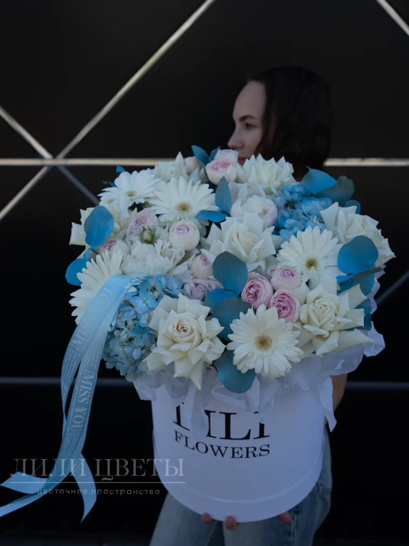 Изумительная цветочная композиция в сочетании белых и голубых оттенков создает атмосферу свежести и спокойствия. В ней гармонично переплетаются нежные белые цветы, символизирующие чистоту и невинность, а мягкие розовые бутоны ассоциирутся с гармонией и умиротворением. Голубые украшения придают свежести и благородства. Такая композиция идеально подойдет для праздничных событий или как знак искренних чувств. Ее воздушность и изящность придают интерьеру ощущение свежести и легкости, создавая уютную и умиротворяющую атмосферу.