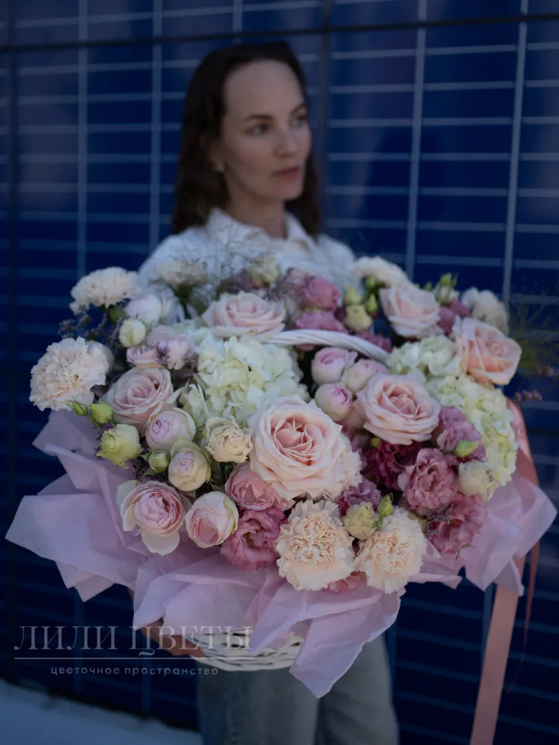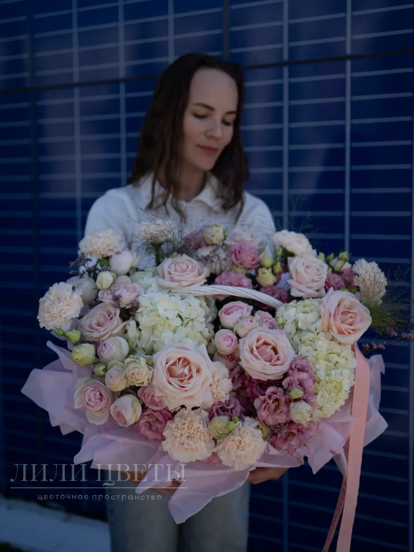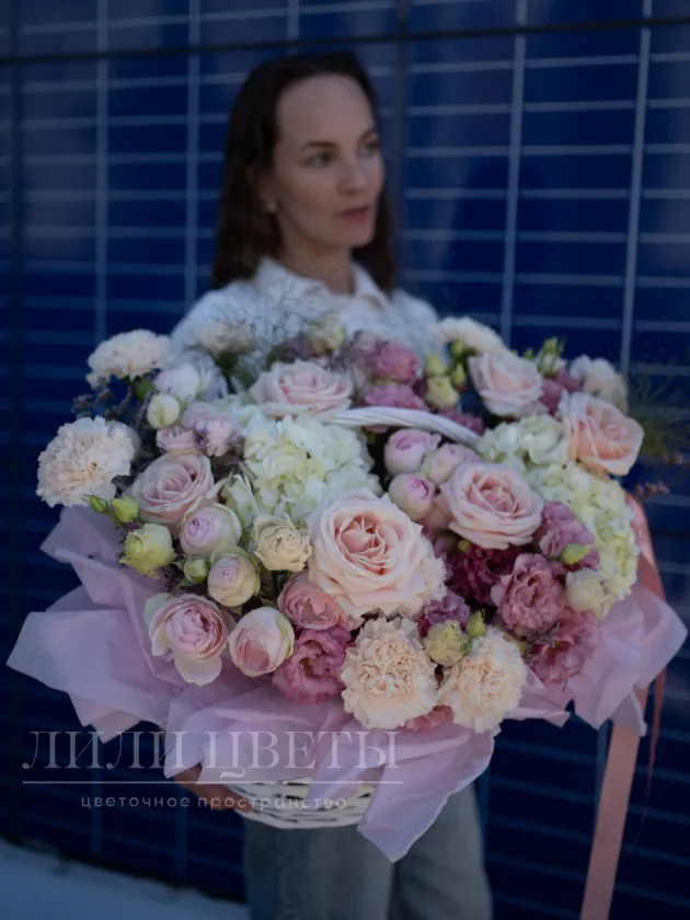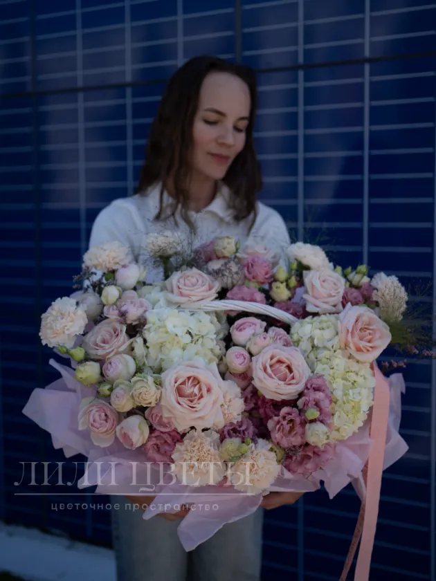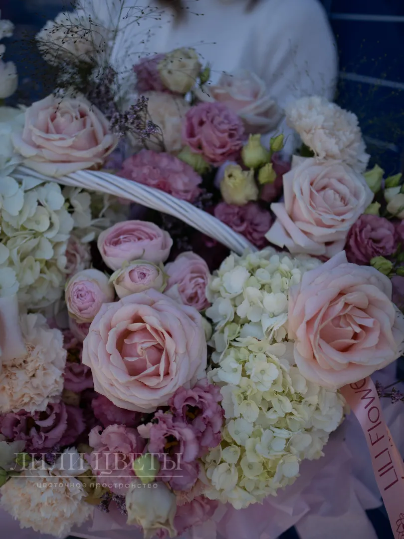 Красивая цветочная композиция в белых и розовых тонах выглядит очень нежно и создает приятное впечатление. В ней хорошо сочетаются белые гортензии, символизирующие чистоту, и мягкие розовые бутоны различных цветов, выражающие любовь и заботу. Такая композиция отлично подойдет для особых случаев, подарит тепло и уют, подчеркнет ваши теплые чувства и создаст атмосферу романтики и спокойствия. Ее легкость и изящество украсит любой интерьер или праздник.