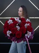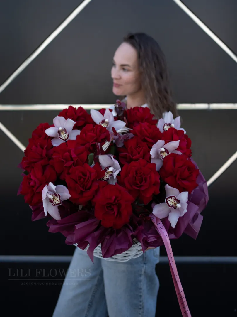 Яркая цветочная композиция в корзинке выполнена в насыщенных красных тонах розы с бело-сиреневыми орхидеями. Красные ажурные розы символизируют страсть и любовь, а орхидеи добавляют элегантности и изящества, создающими гармоничный и эффектный образ. Такая композиция отлично подойдет для романтического подарка или украшения особого события, передавая силу чувств и утонченность.