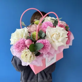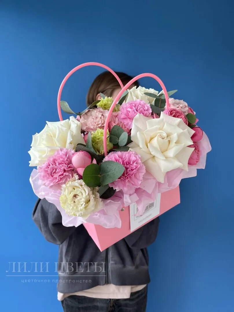 Великолепное сочетание, которое пленяет своим разнообразием и гармонией. Розы придают композиции яркость и выразительность. Эустомы добавляют утонченности и романтизма, а диантусы, известные своим сладким ароматом, наполняют пространство теплом и уютом. Эвкалипт служит прекрасным контрастом, подчеркивая красоту остальных цветов и придавая композиции свежесть и легкость. Композиция в сумочке не только украсит любой интерьер, но и создаст атмосферу радости и гармонии.