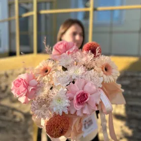 Яркое и многогранное сочетание, способное вдохновить и поднять настроение. Георгины придают букету объем и динамику, а хризантемы добавляют текстурную глубину и разнообразие форм. Розы вносят в композицию нежность, а герберы создают атмосферу радости и веселья. Каждый элемент говорит о любви к природе и искусству, делая ее не только красивым, но и значимым подарком. Цветочная композиция идеально подходит для любого праздника, будь то день рождения, юбилей или просто как знак внимания.
