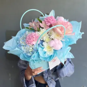 Цветочная композиция в голубом цвете, оформленная в стильной сумочке, представляет собой утонченное и оригинальное решение для создания атмосферы свежести и гармонии. Нежные гортензии и диантусы идеально подходят для любого интерьера. Сумочка добавляет необычности и креативности, превращая цветы в яркий акцент. Эта композиция станет прекрасным подарком на выписку, день рождения, юбилей или просто как знак внимания.