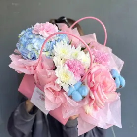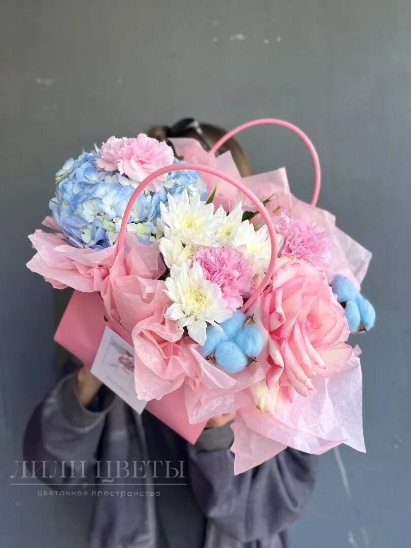 Цветочная композиция розового цвета в изящной сумочке создает атмосферу нежности и романтики. Розовые розы и диантусы отлично сочетаются с нежно голубой гортензией и хлопком, вызывая улыбку и радость. Сумочка, выполненная в стильном дизайне, придает композиции оригинальность и шарм, делая ее идеальным подарком для близкого человека. Такая работа не только украсит интерьер, но и станет незабываемым выражением ваших чувств, радуя глаз и поднимая настроение.