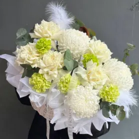 Изысканное сочетание нежных цветов, воплощающее тепло и заботу. В его состав входят ажурные розы и крупные одноголовые хризантемы, которые добавляют объем и свежесть композиции. Чуть зеленоватый диантус придает букету изящность, а веточки эвкалипта - легкую насыщенность. Такой сборный букет станет прекрасным подарком для мамы в любой праздник или просто, чтобы выразить любовь и признательность.