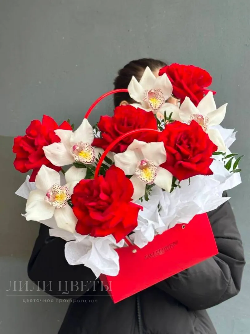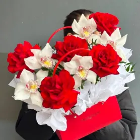 Композиция выполнена в стильной сумочке. В составе изысканные и яркие ажурные розы, создающие яркий акцент. Элегантная орхидея добавляет нотки роскоши и утонченности. В сочетании с мягкими оттенками зелени, композиция выглядит свежо и гармонично. Такая сборная композиция станет прекрасным подарком, подчеркивающая особое уважение и любовь к маме.