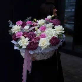 Подарите своим близким незабываемое ощущение красоты и элегантности! В составе корзинки гармонично сочетаются нежные гортензии и ажурные розы, создавая ощущение воздушности и утонченности. Одноголовая хризантема и диантус добавляют ярких акцентов и неповторимой изюминки. Экзотическая орхидея и эустома подчеркнут особенность каждой детали композиции. Такой подарок станет идеальным для тех, кто ценит красоту и оригинальность.