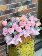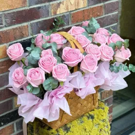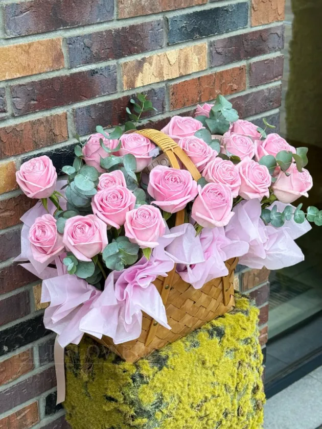 Композиция в корзинке из розовых роз станет изысканным украшением любого интерьера и приятным подарком для особого случая. Нежные розы, символизирующие любовь и романтику, а также свежий эвкалипт, добавляющий композиции свежести и изящества. Корзинка придает изделию уютный и уютный вид, подчеркивая природную красоту цветов. Отлично подойдет для радостных событий, а также для того, чтобы порадовать себя или близких. Благодаря стилистике и выбору растений, композиция гармонично сочетает элегантность и натуральность.