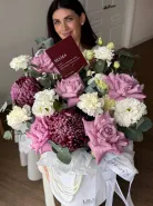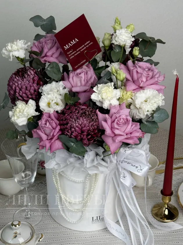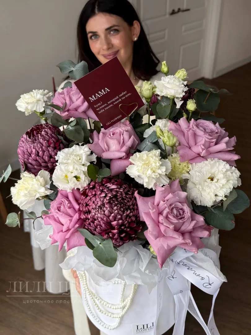 Подарите мгновения роскоши с композицией в коробке, где гармонично сочетаются розовые ажурные розы, крупная и яркая одноголовая хризантема, нежная эустома и светлые диантусы. Эвкалипт добавляет нотки природы в данную композицию и освежает ее. Этот элегантный подарок станет идеальным выражением ваших чувств и добавит изящества любому интерьеру. Подарок, который подчеркнет ваше утонченное настроение и заботу о близких!
