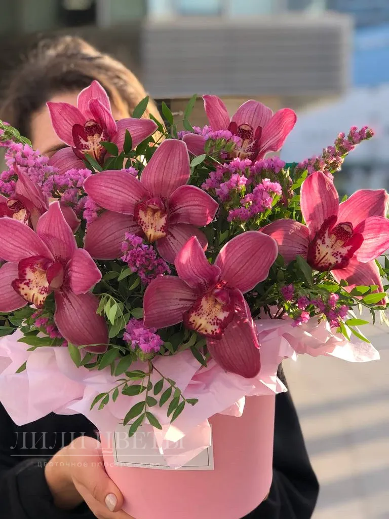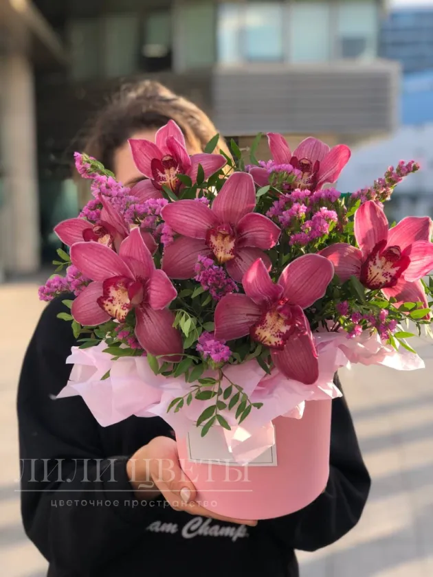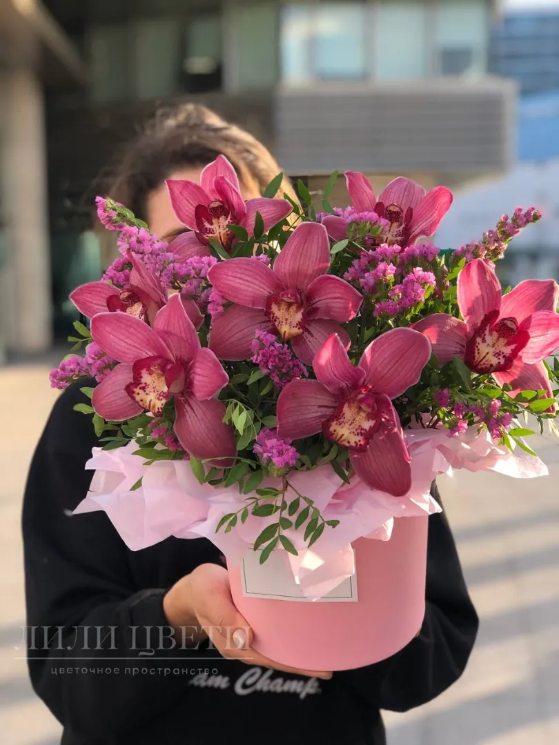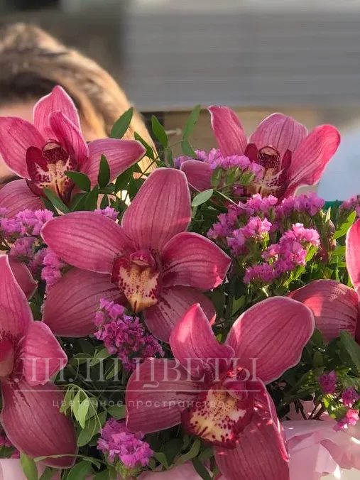 Орхидеи, окутанные статицей, создают невероятно элегантное сочетание цветов и текстур, придающее этому аранжированию утонченный и роскошный вид.