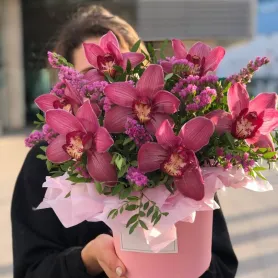 Композиция в шляпной коробке из орхидей со статицей