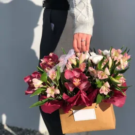 Эта утонченная композиция в сумочке из орхидей, альстромерии и хлопка олицетворяет нежность природы, сливая в себе изысканные цветочные акценты с теплотой натуральных материалов.