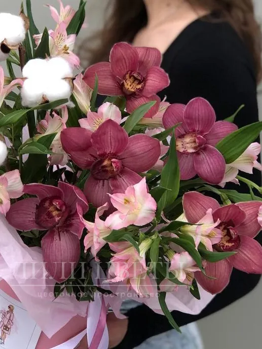 Эта изысканная композиция в шляпной коробке обрамлена нежными орхидеями и альстромериями, создавая атмосферу изысканной элегантности.