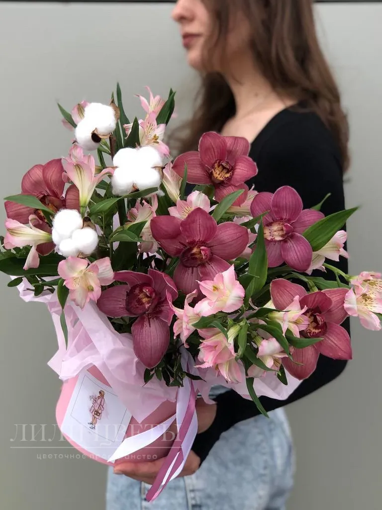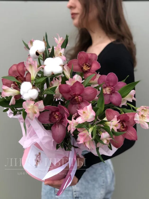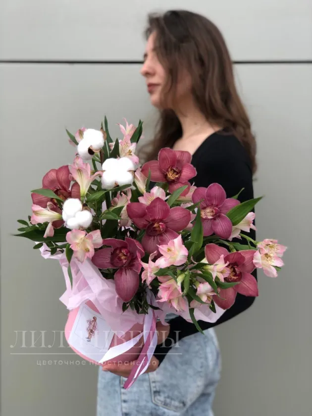 Композиция в шляпной коробке из орхидей с альстромерией