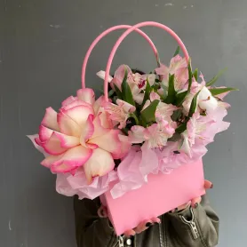 Розовая композиция в сумочке с альстромерией