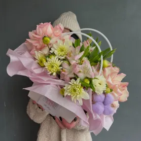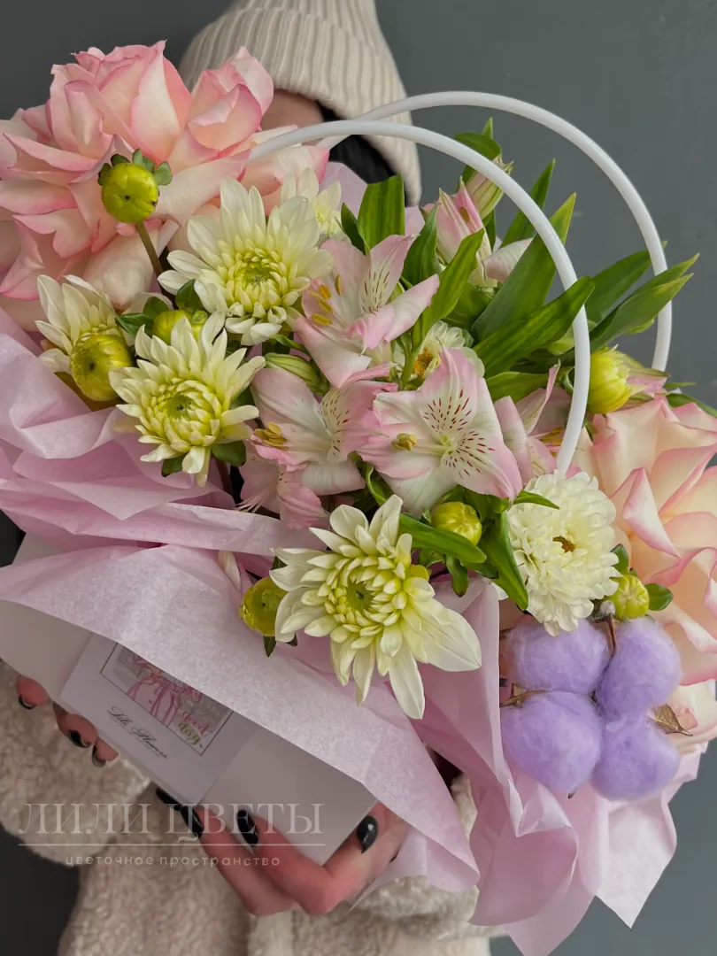 Композиция в сумочке из ажурных роз, альстромерии, хризантем и хлопка - это привлекательное сочетание изысканных цветов, создающих впечатляющий визуальный эффект.