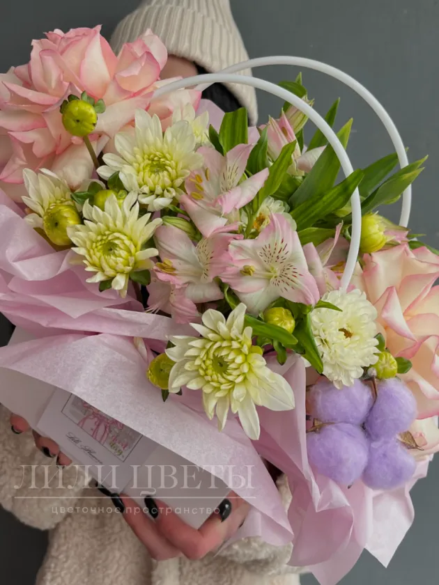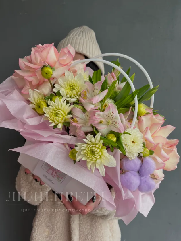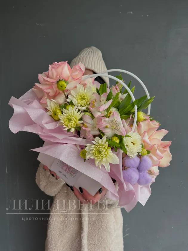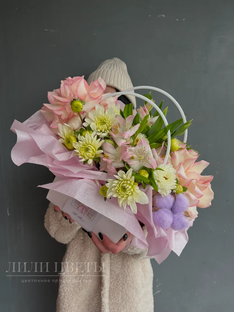 Ажурные розы и альстромерии придают композиции изящность, а хризантемы и хлопок добавляют игривости и свежести.