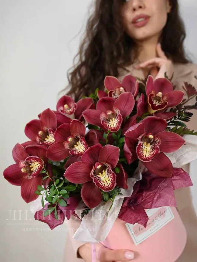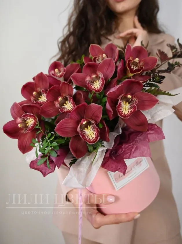 Композиция в шляпной коробке из бордовых орхидей