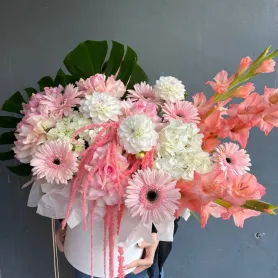 Композиция в шляпной коробке с георгинами
