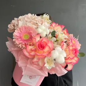 коробка из гортензий, гербер, ажурных роз и альстромерии