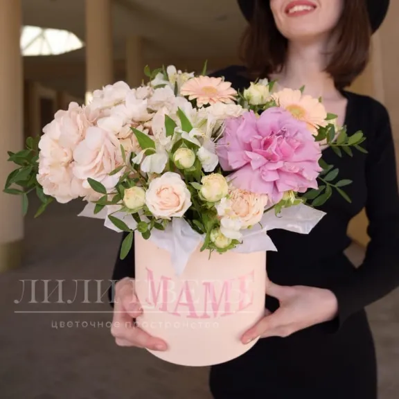 Шляпная коробка из гортензий, гербер, роз, альстромерии, кустовых роз и писташа представляет собой элегантную композицию, объединяющую нежность и красоту разнообразных оттенков.