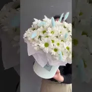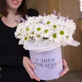 Шляпная коробка из белых кустовых хризантем и фиолетовых сухоцветов представляет собой изысканную комбинацию цветов, создающую впечатление изящества и элегантности.