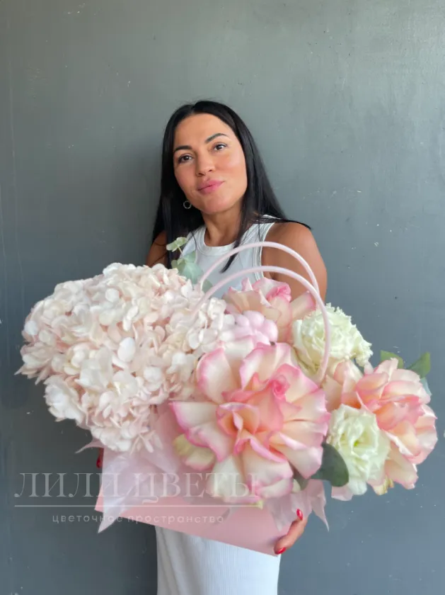 Замечательная композиция в сумочке, состоящая из нежных роз, гармоничных гортензий, изысканной эустомы, легкого хлопка и ароматного эвкалипта - прекрасный подарок к 1 сентября, который олицетворяет красоту и начало нового учебного года.
