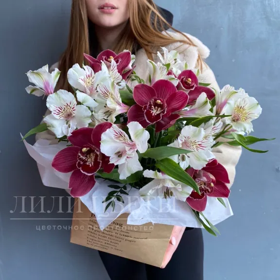 Загадочные оттенки орхидеи, прекрасно дополняемые яркими и изящными цветами альстромерии, создают впечатляющий контраст, в то время как нежно-зеленые веточки писташа придают аранжировке изысканную глубину и природную прелесть.