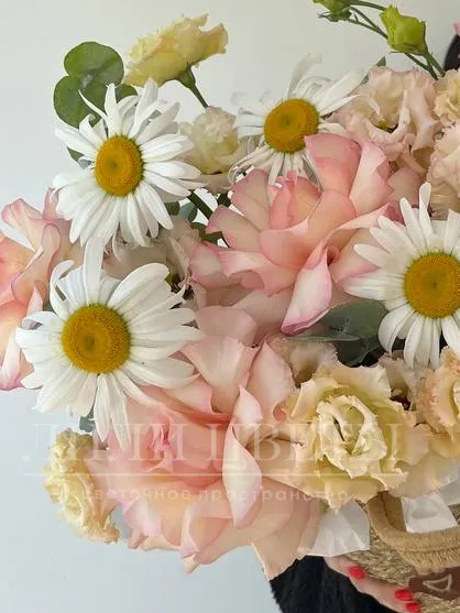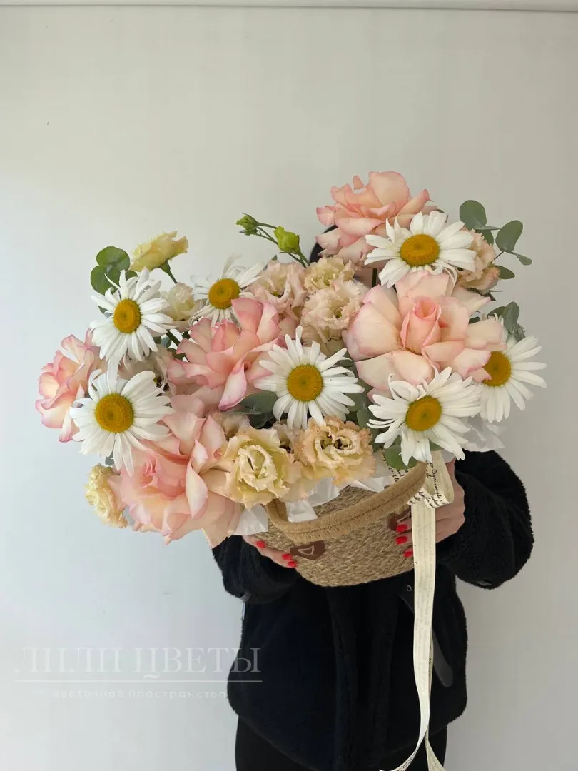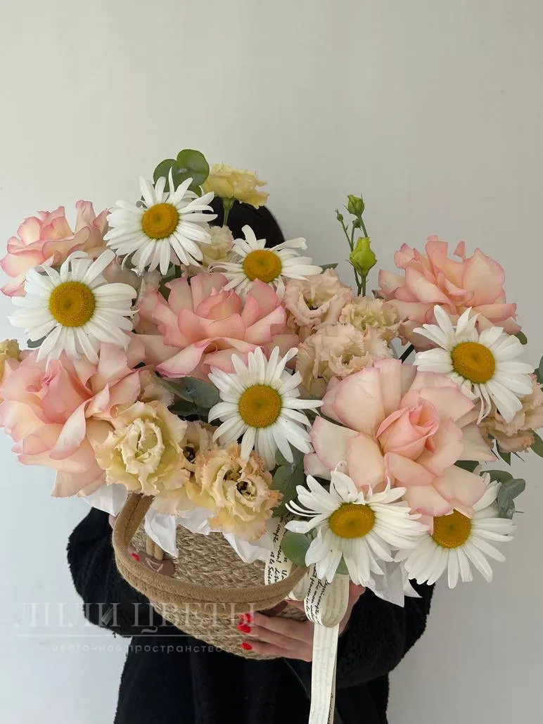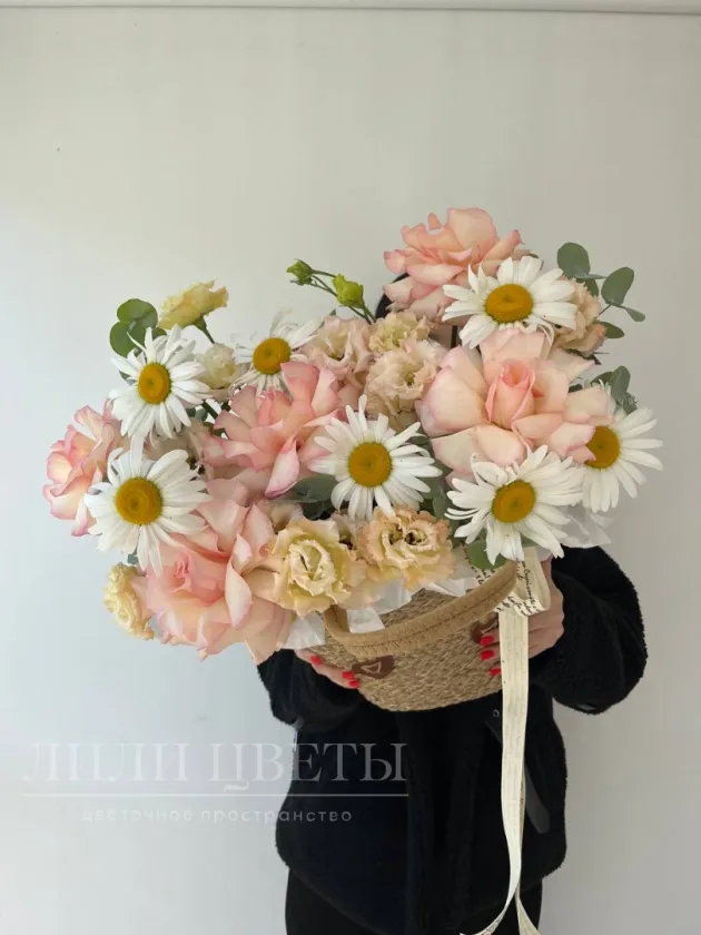 Композиция в плетеной корзинке с ромашками