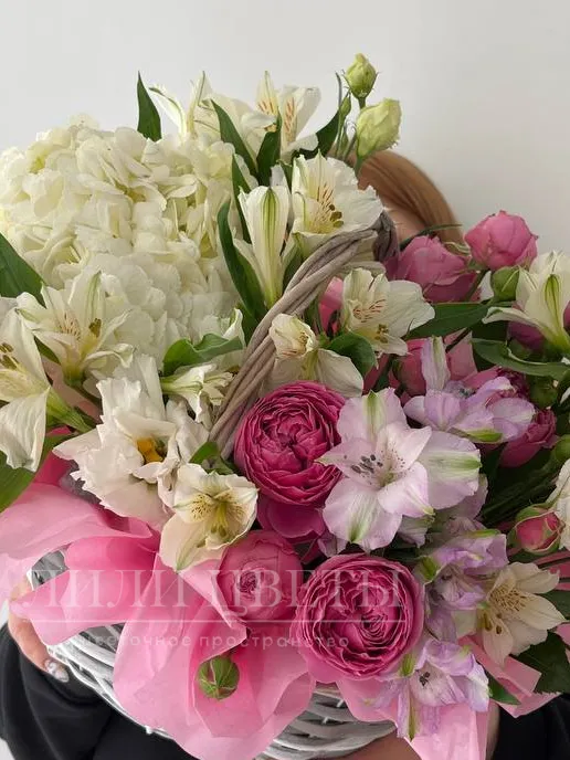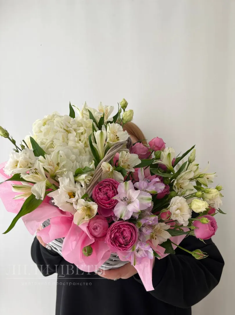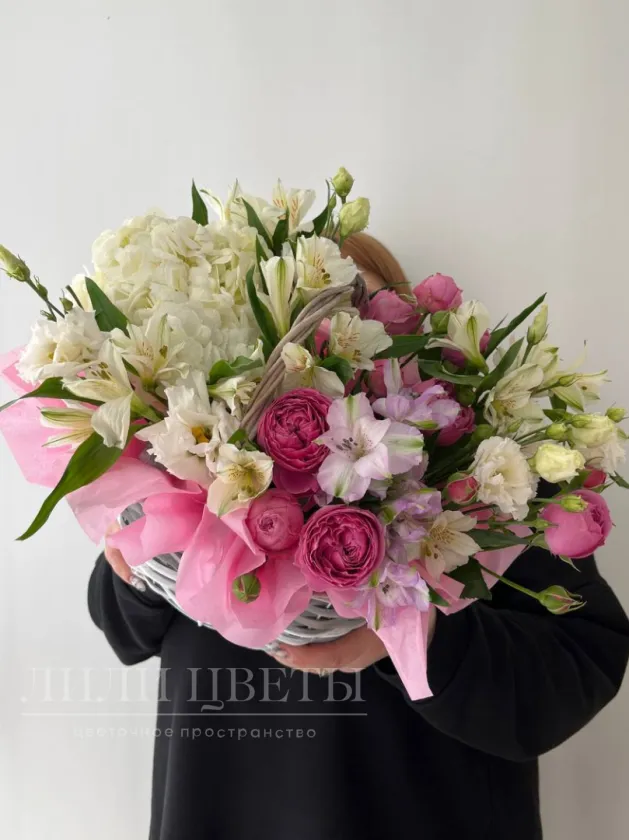 Нежная сборная корзина с альстромерией и кустовыми розами