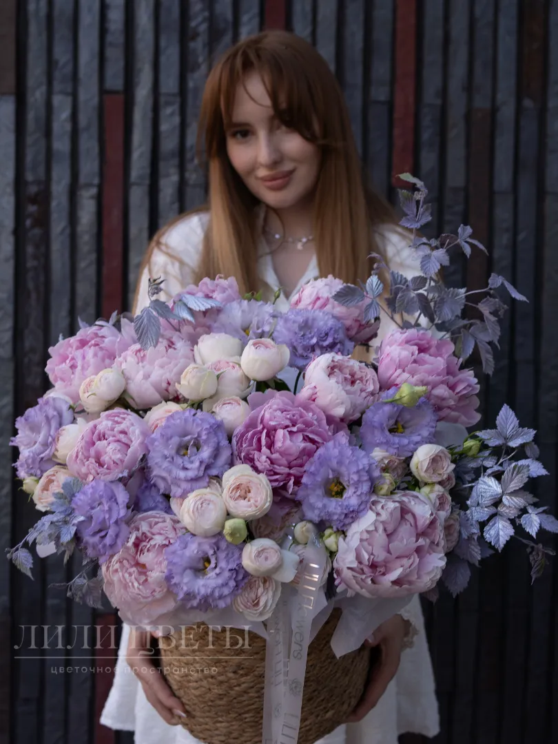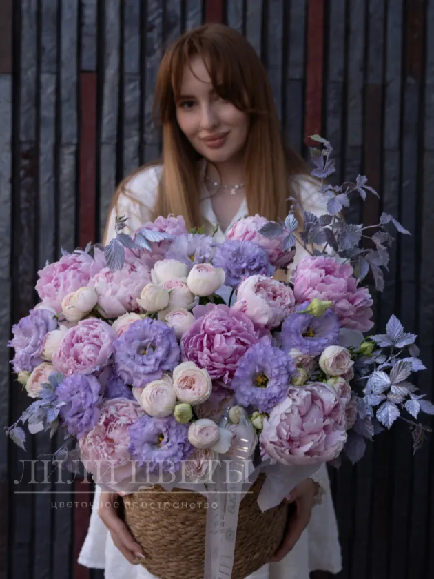 Композиция из гортензий, пионов и роз в плетеной корзине