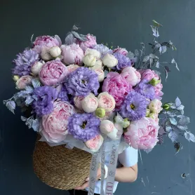 Композиция из пионов, пионовидных рох, эустом и веточек малины