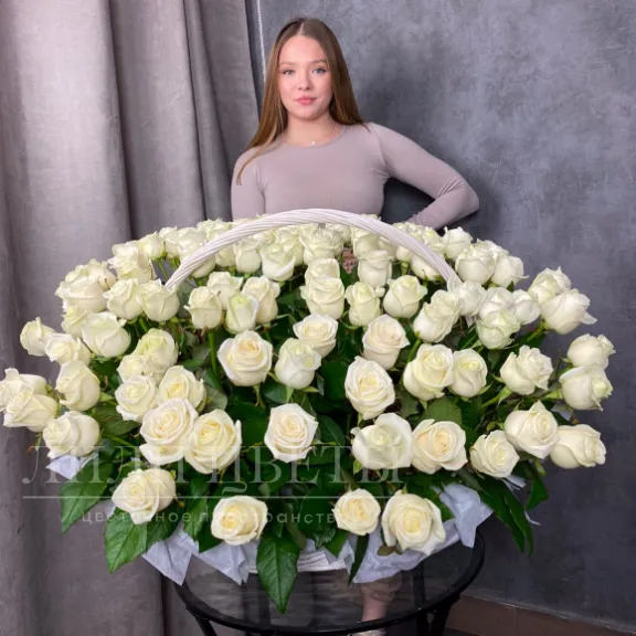 Композиция из 101 белой розы создает элегантный и изысканный внешний вид.