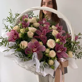 Эта композиция цветов в корзине из кустовых роз, орхидей и писташа создает великолепное сочетание изящества и свежести.