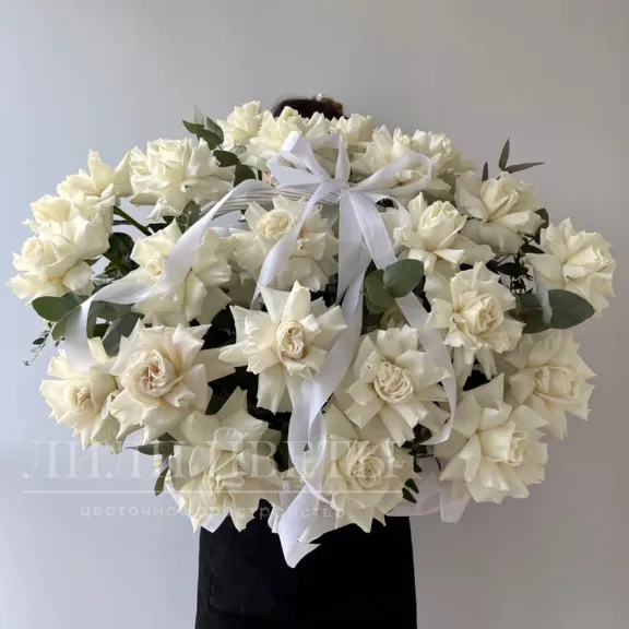 Белые розы и эвкалипт создают утонченное сочетание, добавляющее изысканности любому интерьеру.