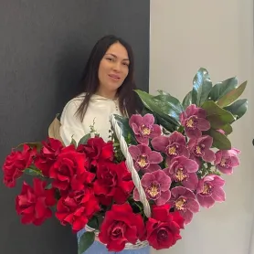 Композиция в корзине из кружевных роз с орхидеей