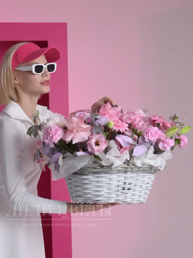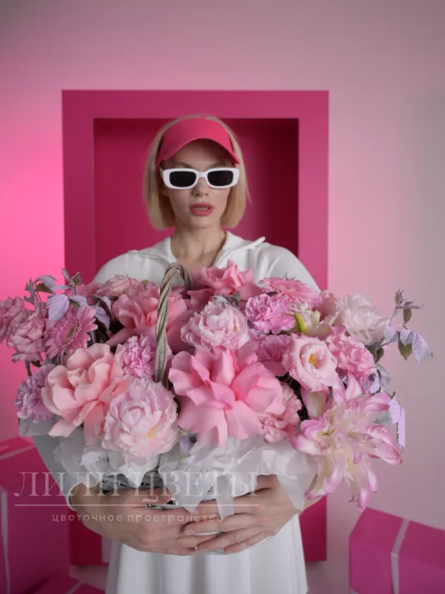 Эта розовая композиция в корзине из роз, гербер, пионов, лилий, эустомы, гвоздик и веток малины наполнена изяществом и нежностью.