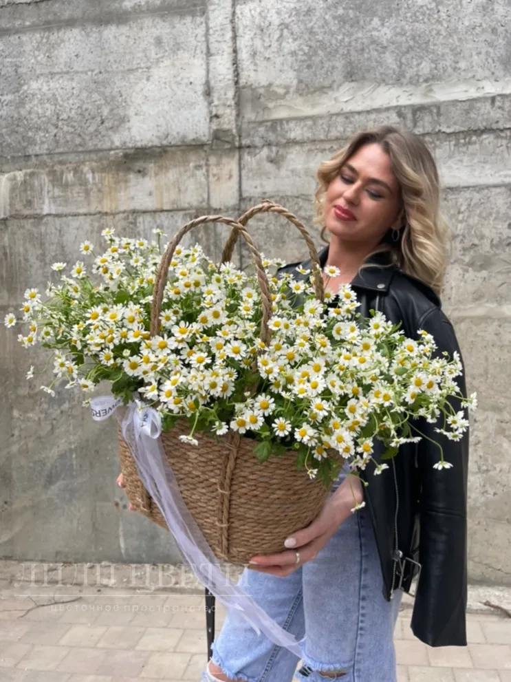 В корзине сумочки из панацетума находится композиция изящных и нежных цветов, создающая впечатление живого сада.