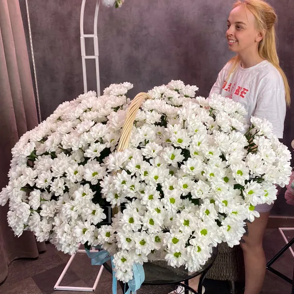 Эта композиция корзины создана из нежных белых кустовых хризантем, которые идеально подходят для оформления свадеб или других торжественных мероприятий.