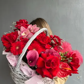 Эта удивительная композиция в корзине сочетает в себе нежные розы и орхидеи с яркими герберами и кустовыми розами, создавая атмосферу романтики и изысканности.