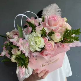 Коробочка из альстромерий, ажурной розы и пионовидных рох