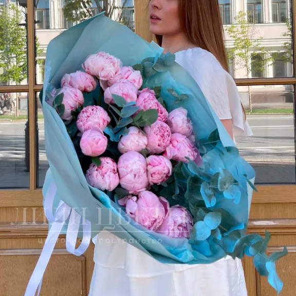 Этот утонченный монобукет из розовых пионов с эвкалиптом создает нежную и романтическую атмосферу.