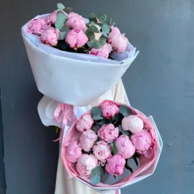 Роскошные розовые пионы выделяются своей изысканной красотой, а веточки эвкалипта добавляют букету легкость и ароматную нотку, создавая неповторимую атмосферу романтики.