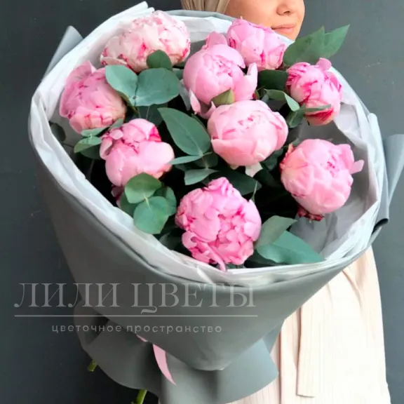 Розовые пионы привлекают взгляды своей красотой и изяществом, в то время как эвкалипт добавляет букету свежести и деликатного аромата, делая его идеальным подарком для особых моментов и любых особенных событий.